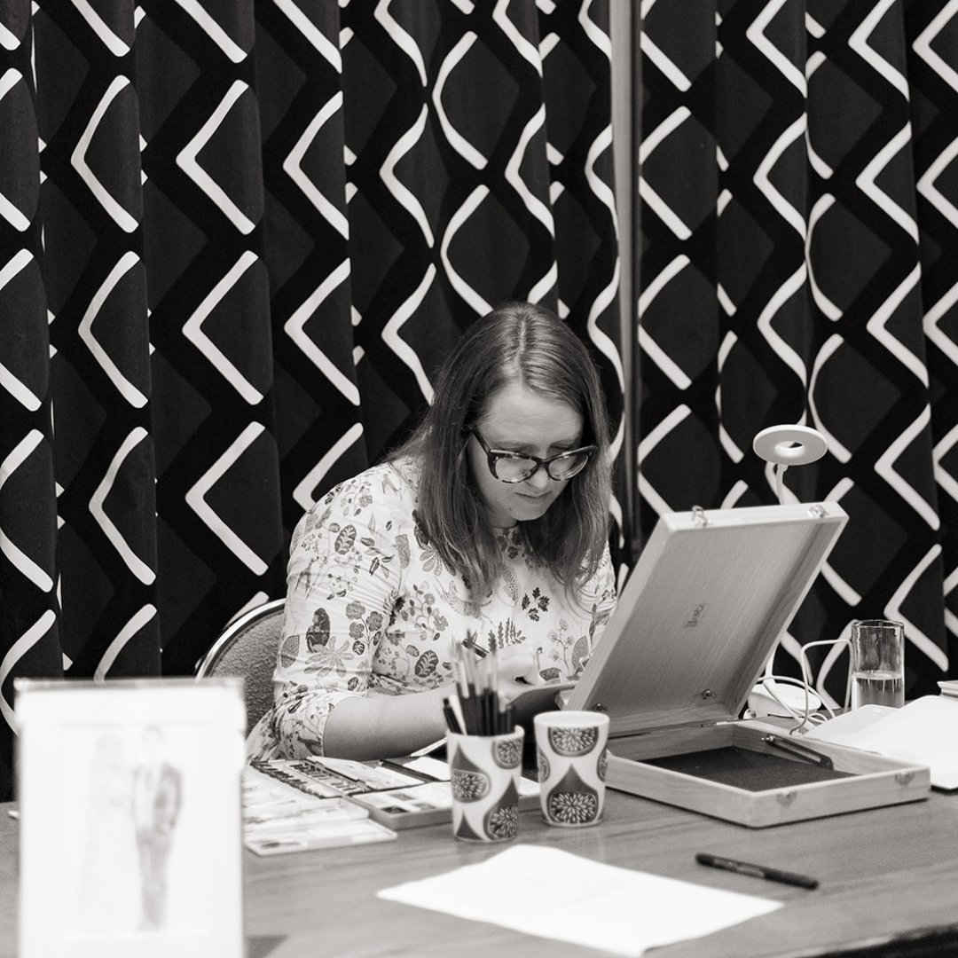 I illustrated guests at Natalie and Robert’s wedding in 2023 at the Hoxton Hotel in Holborn. They have a fantastic apartment suite that you can hire out for your wedding reception, and I was based in a separate room off to the side of the drinks reception and wedding breakfast. It meant that I had plenty of space to work on a large table set up in the room, and I took photos of guests to work from for my illustrated portraits.